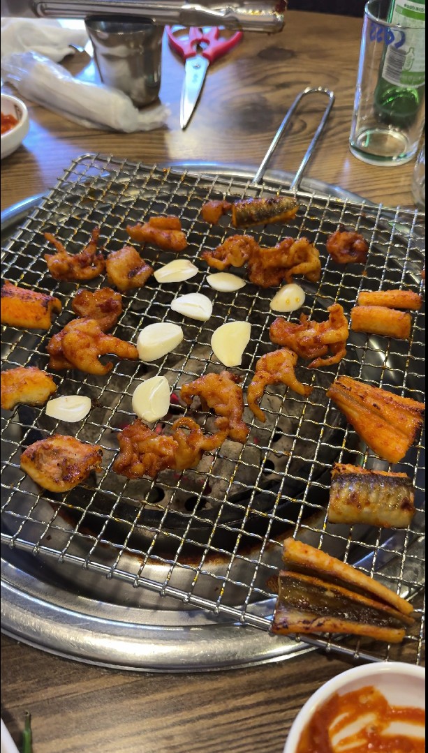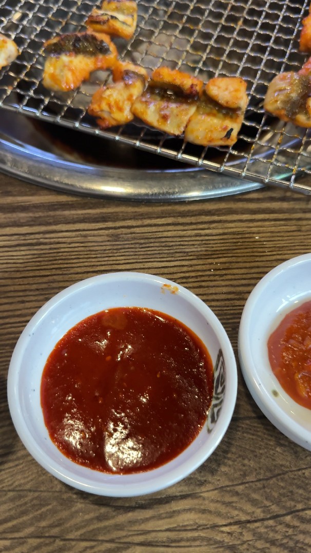 아나고를 주문하면 밖에서 사장님이나 일하는 친구께서 구워주십니다. 그러면 석쇠 테두리에 저렇게 놔 주시는데 먹을때 중앙으로 옮겨 마자 익혀서 먹으면 되는데... 문제는 저게 3인분이라는 겁니다. 양이 넘넘 많이 줄었어요. 그렇다고 곰장어를 시킬 순 없습니다. 이 집은 아나고 맛집이니깐요. 물론 곰장어를 좋아하는 분들은 곰장어를 시키기도 하는데 저는 무조건 아나고입니다. 두번 째 주문이라면 모를까...그리고 이 집의 비법은 바로 저 빨간 장입니다. 아나고의 맛을 격상 시켜주는 바로 그 비법 양념!!!
