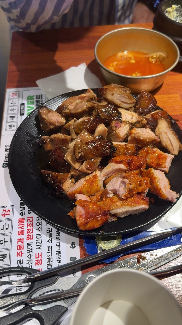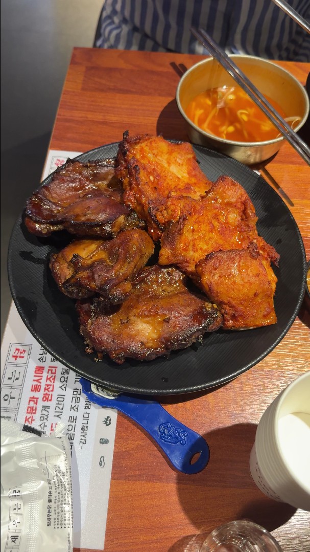 초벌을 해주시는데요... 이런 메뉴판을 안 찍었네요. 이게 키오스카 편하긴한데... 이렇게 메뉴판을 올리는데는 한 번씩 놓치게 되더라고요. 물론 회비로 결제하니까 가격 신경 안쓰고 주는대로 먹은 것도 없지않지만 ㅋㅋ 초벌을 해주시는데 두가지 맛을 시켰나봅니다. 그냥 먹어도 맛있는데 초벌한 음식을 근무자께서 이렇게 먹기 좋게 잘라주십니다. 그리고 숯불 석쇠에다가 올려서 불맛까지 곁들이니까 상당히 맛있더군요. 원래 제가 닭은 튀겨야된다 주의 였는데 정말 정말 튀기지 않아도 맛있는 닭 요리였습니다.