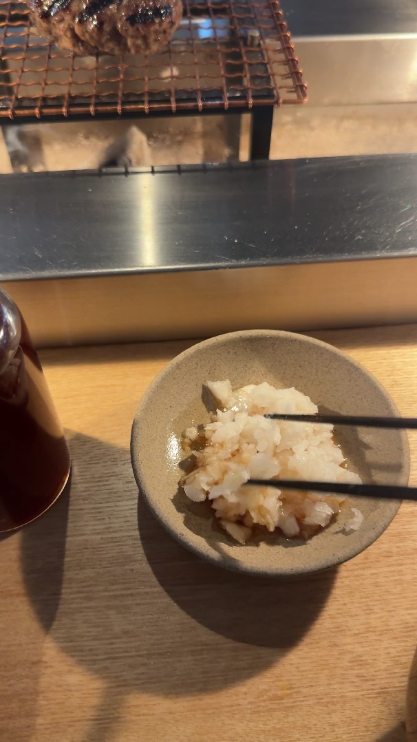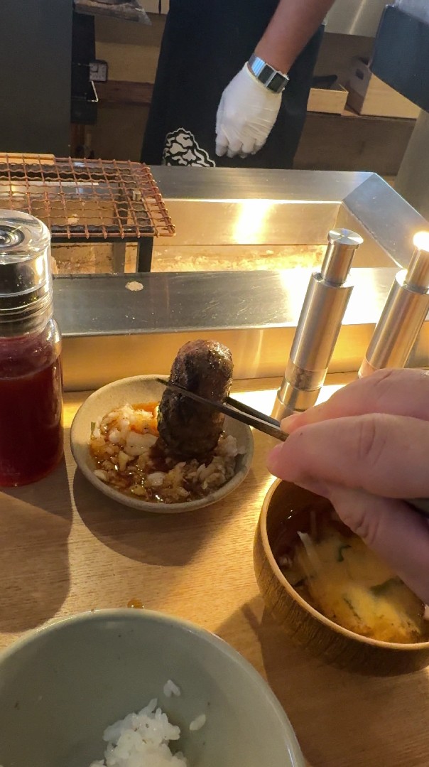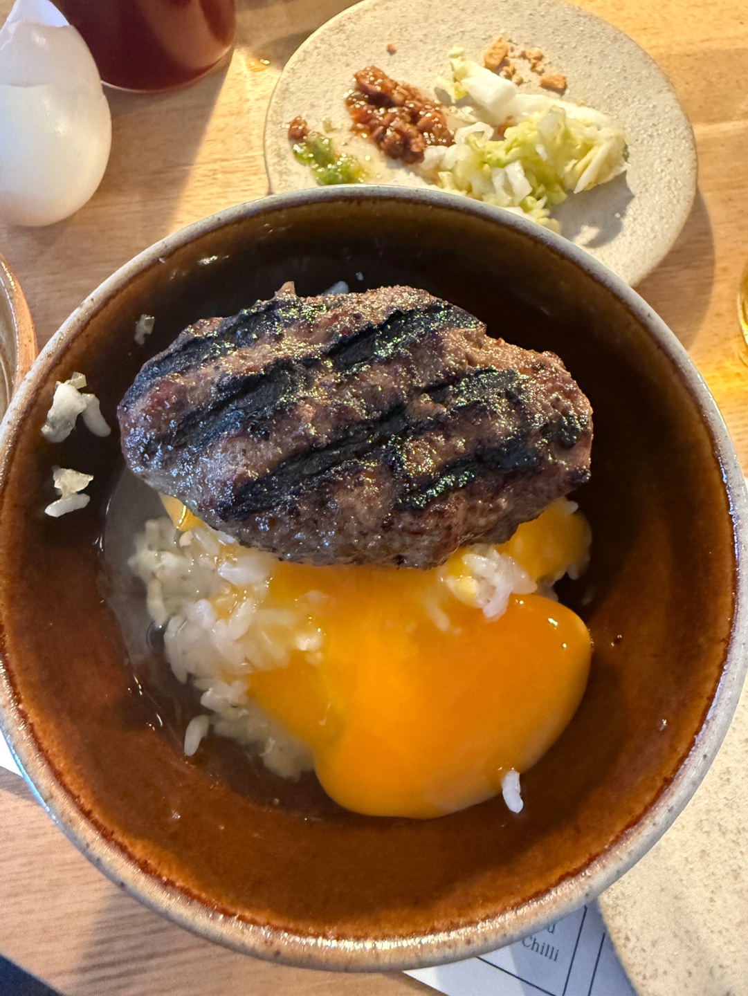 함바가 3개를 하나씩 하나씩 먹는 속도에 맞춰서 내주는데... 첫번째는 걍 먹으라고 합니다. 함바가를 밥위에 올려 놓으면 육즙이 밥에 베어 더 맛있다고 하네요. 두번째는 무였던거 같던데...무를 간거에 폰즈를 적셔서 찍어 먹으라고 하더라고요. 세번째는 밥에 계란을 풀어 적셔먹으라고 하던데... 어떤게 젱 맛있냐 물을 필요없어요. 다 맛나요.