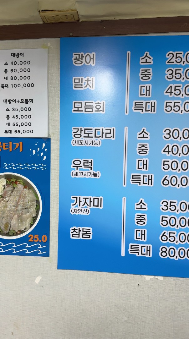 제가 방문할때가.... 대방어철이라 "모듬회+ 대방어" "소"자를 주문했는데... 저겁니다. 35,000원짜리. 그얘기는 광어 25,000원 주문하면 광어가 저만치 나온다는 얘기겠죠? 불알친구랑 둘이 갔는데... 남았습니다. 솔직히 회라는게 실컷 먹어도 한계가 있으니까...남을 수 있죠. 마이 남았습니다. 양이 엄청나요.