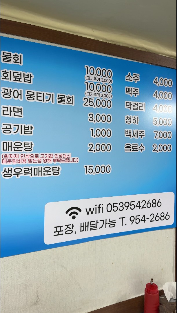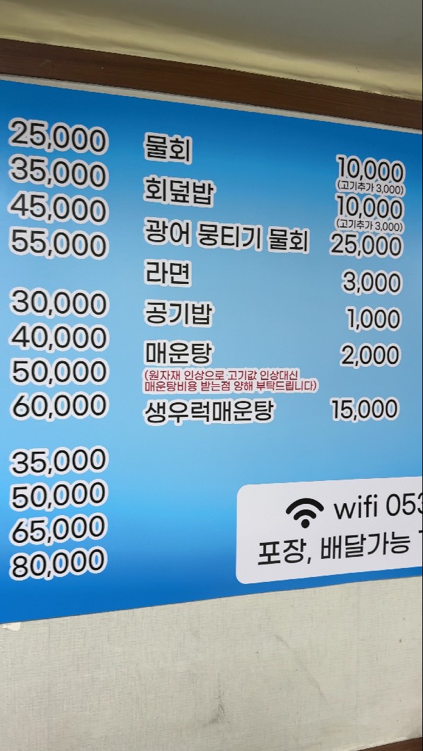 메뉴판 함 볼까요? 어때요? 가격 직이지요? 말씀드렸잖아요. 가성비 횟집이라고... 요새 광어 "소"자를 어디서 25,000원에 주문을 합니까... 포장 전문점도 25,000원짜리 운영안해요. 그럼 당연히 양이 적을꺼라? 아닙니다. 회 만큼은 아~주 푸짐하게 썰어주십니다. 근데 다시 한 번 말씀드리지만 스끼. 기본찬은 기대하지 마세요. 계란찜하고 몇개 백김치등... 진짜 회의 풍미를 충분히 전할 수 있는 최적의 요원?들로만 구성되어 있어요. 대신 마늘이랑 고추, 와사비는 듬쁙 줍니다.