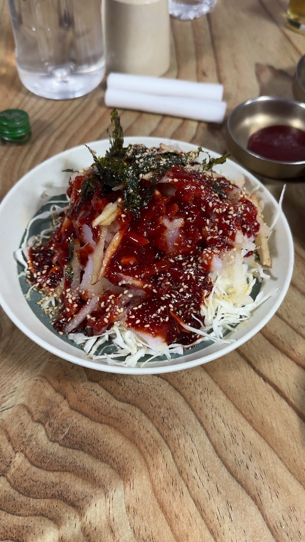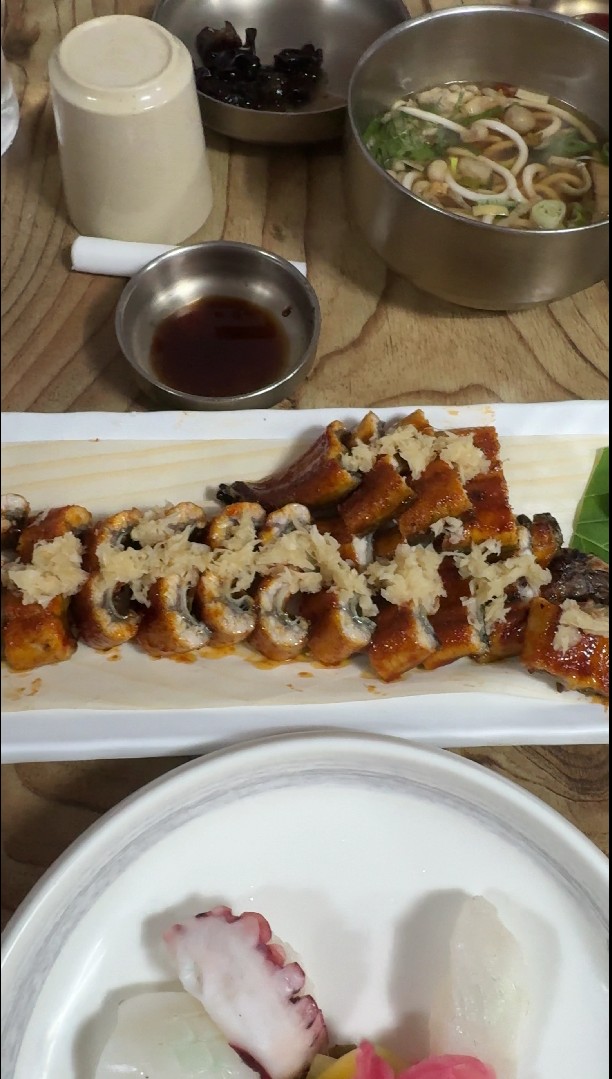 먼저 말씀드리지만 이건 ‘내돈내산’ 후기입니다! 친구 가게지만 계산은 확실히 해야줘. 캐셔에는 항상 엄마가 계시거등요.물론 친구 가게라 서비스가 없진 않았지만, 공짜로 먹은 건 절대 아니에요 ㅎㅎ저는 회보다는 민물 장어구이를 좋아해서 민물장어구이랑 생선초밥+우동 세트(₩11,000) 를 주문했습니다. 기본 찬도 깔끔하고, 특히 무침회가 정말 예술이에요. 삼삼구이의 초장 맛이 압도적이라, 초장에 듬뿍 찍어 먹는 재미가 있습니다. 친구라 그런지 양도 살짝 많았던 것 같긴 하네요 😄