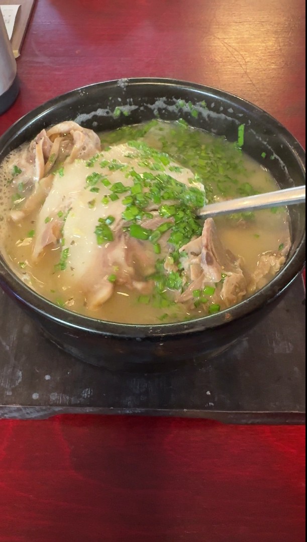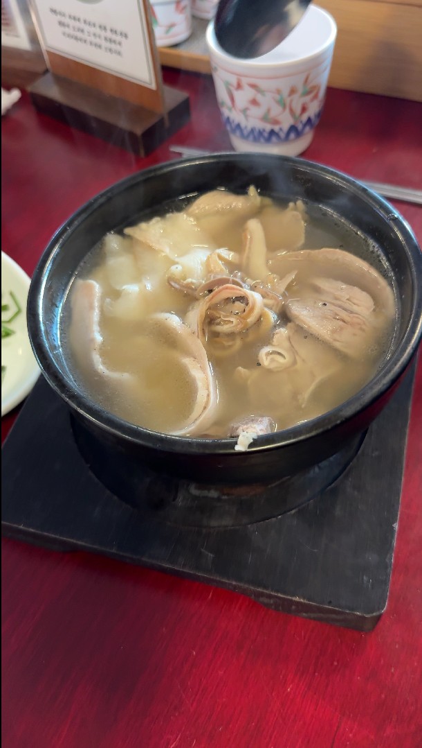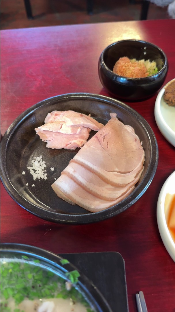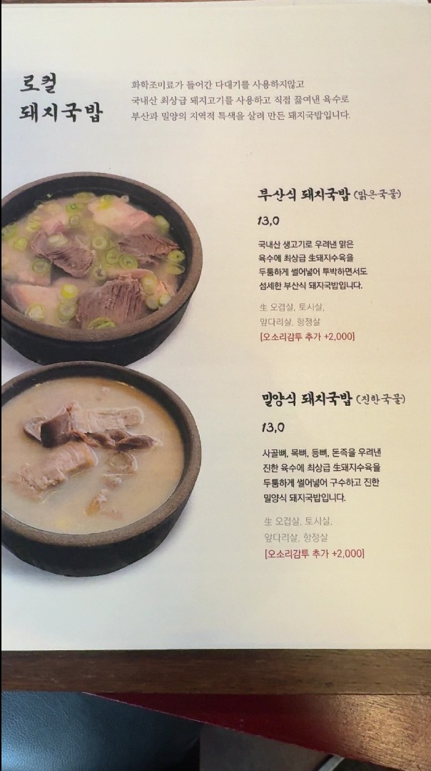 외국인 관광객들이 상당히 많길래 관광지라 비싼거라 판단했지만 실내/외 인테리어나 직원들의 복장, 그리고 돼지국밥집에서 나지 않는 돼지고기 냄새는 전자 보다는 후자에 이유라 생각하고 잔뜩기대하고 기다리고 있었습니다. 맑은 국물의 돼지국밥은 비교를 하자면... 나주 곰탕 스러운 느낌? 진한 국물의 돼지국밥은 일본 라멘에 푸~욱 고은 돼지 육수 느낌? 그런데 웬걸 진한 국물보다 맑은 국물의 냄새가 더 나는 건 저만 그런건 아니었어요.