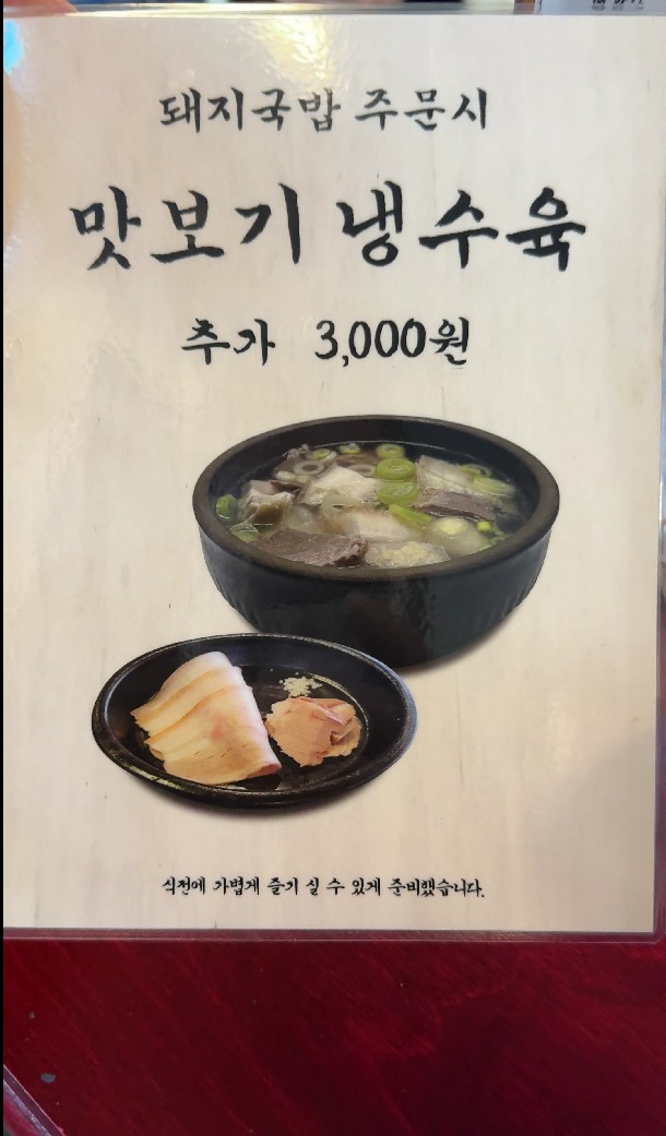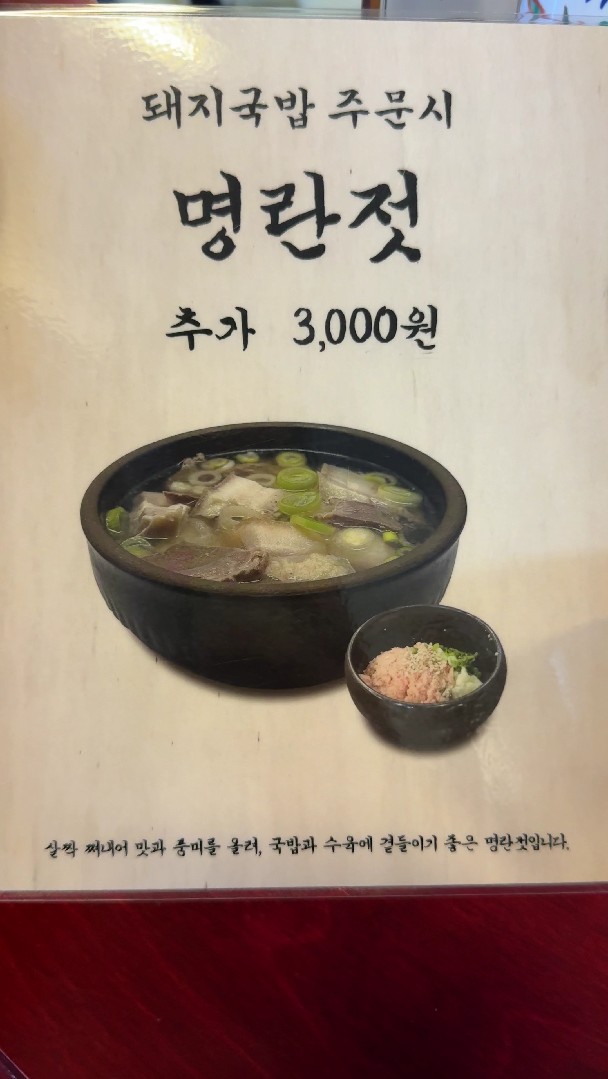 3천원을 더 추가하시면 명란젓을 저만치 줍니다. 돼지국밥과 명란젓이 상당히 잘어울리더라고요. 맛있었어요. 저건 충분히 추가해서 시켜 먹어볼 만한 메뉴인 것 같습니다.