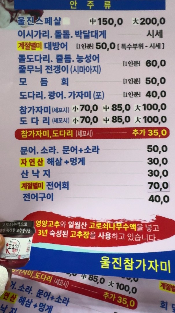 충분히 이 곳 울진참가자미에서 먹어도 됩니다. 멀리 포항까지 가시면 약주 한잔도 쉽지 않잖아요? 회에는 한잔이 또 어울리니깐요.