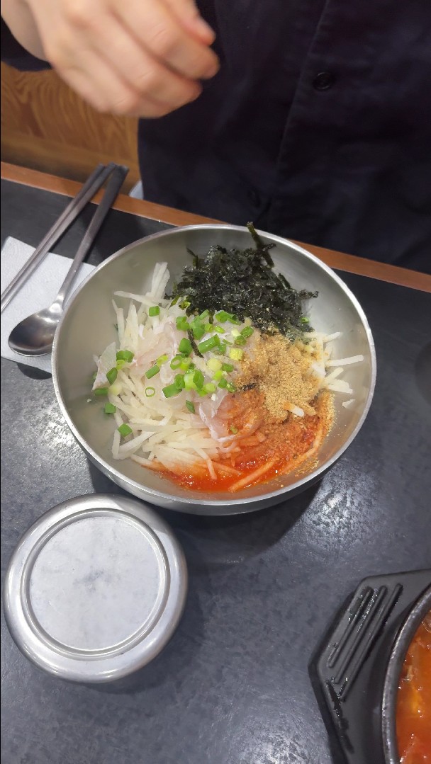살얼음물회는 흔히 아는 물회 스타일, 비빔물회는 포항쪽가니깐 이런 식으로 물회를 많이 파시더라고요? 포항 스타일인 것 같아요. 제 취향은 당연히 살얼음 동동 살얼음물회이지요. 가격이 좀 비싸지만 도다리와 가자미 회라 확실히 식감이 좋더라고요...그런데... 진짜 좀 비싸긴 했어요...물회가 25,000원이라...선뜻 시킬 수 있는 수준의 가격이 아니라 생각했는데... 손님이 엄청 많더라고요... 확실히 맛이 있는 집이긴 했어요...