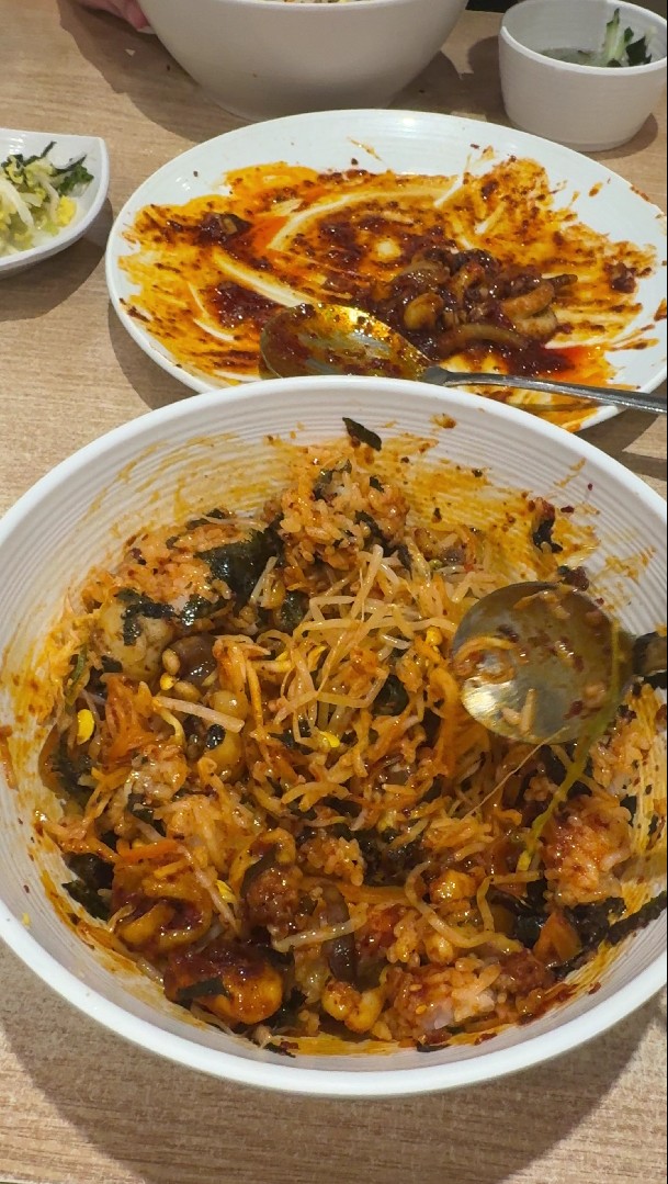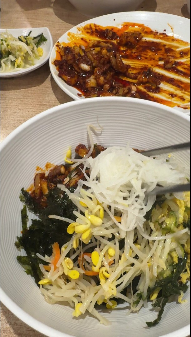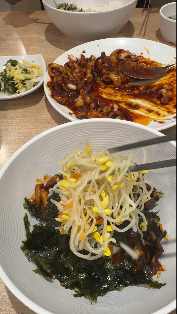 쭈꾸미 볶음은 불향과 깊은 양념의 조화가 돋보입니다. 쭈꾸미와 낙지의 탱글탱글한 식감은 물론, 매콤한 양념이 입맛을 확 사로잡아 술안주나 식사로도 손색이 없죠. 매콤함에 정도는 충분히 조절하여 주문 가능합니다. 너무 자극적이지 않으면서도 칼칼한 맛을 살려, 자연스럽게 밥과 찰떡궁합을 자랑하는데요. 함께 곁들여진 밑반찬과 미역국도 식사를 더욱 풍성하게 만들어 줍니다. 쭈꾸미낙지볶음을 밥 위에 올리고, 바삭한 김가루를 듬뿍 올려 비벼 먹는 비빔밥 스타일은 이곳만의 특색 있는 즐기는 방법입니다. 매콤한 양념과 고소한 김, 쫄깃한 해산물의 만남은 한 끼 식사로 완벽하지요. 식사의 고소함과 매콤함이 절묘하게 어우러진 모습이 눈길을 끕니다. 해산물과 콩나물, 아삭한 야채가 어우러져 맛뿐 아니라 식감까지 풍부하게 살렸습니다.