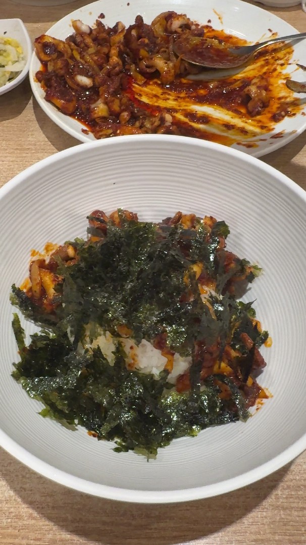 쭈꾸미 볶음은 불향과 깊은 양념의 조화가 돋보입니다. 쭈꾸미와 낙지의 탱글탱글한 식감은 물론, 매콤한 양념이 입맛을 확 사로잡아 술안주나 식사로도 손색이 없죠. 매콤함에 정도는 충분히 조절하여 주문 가능합니다. 너무 자극적이지 않으면서도 칼칼한 맛을 살려, 자연스럽게 밥과 찰떡궁합을 자랑하는데요. 함께 곁들여진 밑반찬과 미역국도 식사를 더욱 풍성하게 만들어 줍니다. 쭈꾸미낙지볶음을 밥 위에 올리고, 바삭한 김가루를 듬뿍 올려 비벼 먹는 비빔밥 스타일은 이곳만의 특색 있는 즐기는 방법입니다. 매콤한 양념과 고소한 김, 쫄깃한 해산물의 만남은 한 끼 식사로 완벽하지요. 식사의 고소함과 매콤함이 절묘하게 어우러진 모습이 눈길을 끕니다. 해산물과 콩나물, 아삭한 야채가 어우러져 맛뿐 아니라 식감까지 풍부하게 살렸습니다.