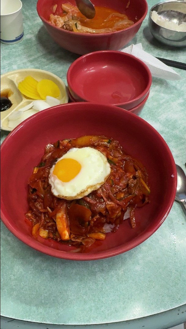 음식이 나오는 순서가 있습니다. 한 테이블에 다른 메뉴라면 나오는 순서가 달라요. 우선 짬뽕과 짬뽕밥이 먼저 나오고요. 그 다음 중화 비빔면과 비빔밥이...그리고 마지막에 볶음밥이 나옵니다. 집사람이 주문한 짬뽕밥이 먼저 나왔어요. 음... 채수를 기반으로 궁물이 아~주 깔끔한 맛입니다. 살짝 얼큰했으면 좋겠다 싶으시면 고추가루를 요청해 주세요. 은은하게 매운맛이 아~주 좋습니다.