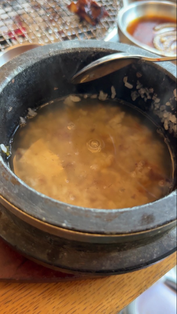 고기만 먹기엔 허전하잖아요? 여긴 된장찌개도 직접 끓이는 느낌이 나는 찐 맛. 뚝배기에 보글보글 끓여져 나오는데, 안에 두부, 애호박 등 건더기도 실하고 맛도 기가 막히네요. 돌솥밥은 같이 주는 나물과 함께 저는 맛나게 비벼먹었습니다. 된장찌개와 함께 맛있게 비빈 밥위에다가 돼지갈비 한 점 올려서 같이 먹으면... 참으로 감사한 맛입니다.