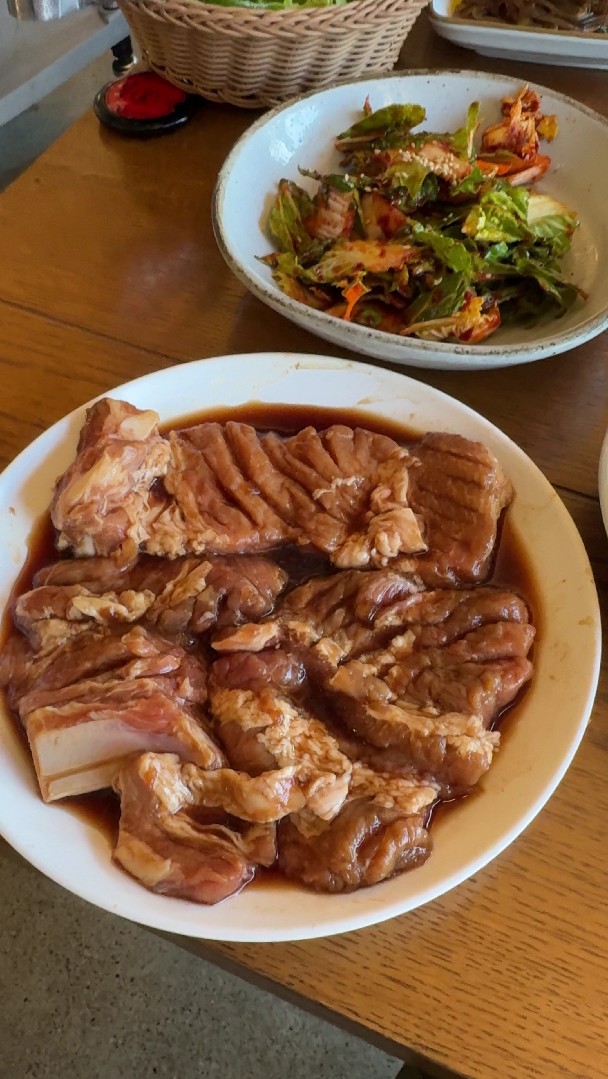 이 집의 시그니처는 뭐니 뭐니 해도 돼지갈비지요. 숯불이 은은하게 깔려 있고, 고기를 올리면 그 특유의 불향이 그대로 배어들어요. 저랑 김실장은 숯불정식으로 옛날 갈비랑 영양 돌솥밥으로 주문했습니다. 고기 두께도 두툼하고, 양념은 자극적이지 않아서 계속 먹어도 물리지 않아요. 그리고 기본 반찬이 푸짐하게 나옵니다.