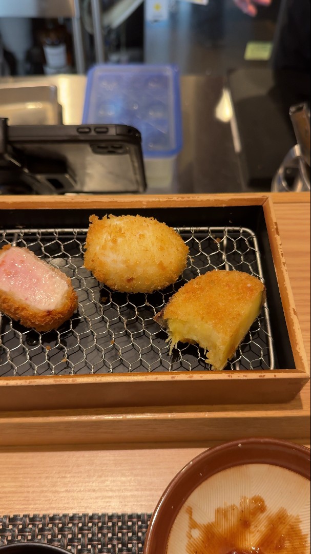 집사람이랑 저랑은 SET MEAL(A)로 애들 둘은 SET MEAL(WAGYU)로... 어른들은 싼거 애들은 비싼거... 얼로 주문했습니다. 구성은 고기 2, 야채튀김, 계란튀김 이렇게 구성됩니다. 튀김용 조리기구가 2개 있는데 하나는 고기를 튀기는 용도로 또 하나는 야채를 튀기는 용도로 사용하나 봅니다. 야채 튀김에는 야콘 튀김이랑 고구마 튀김... 이렇게 구성되어 나오는데 야콘 사진이 없넹~